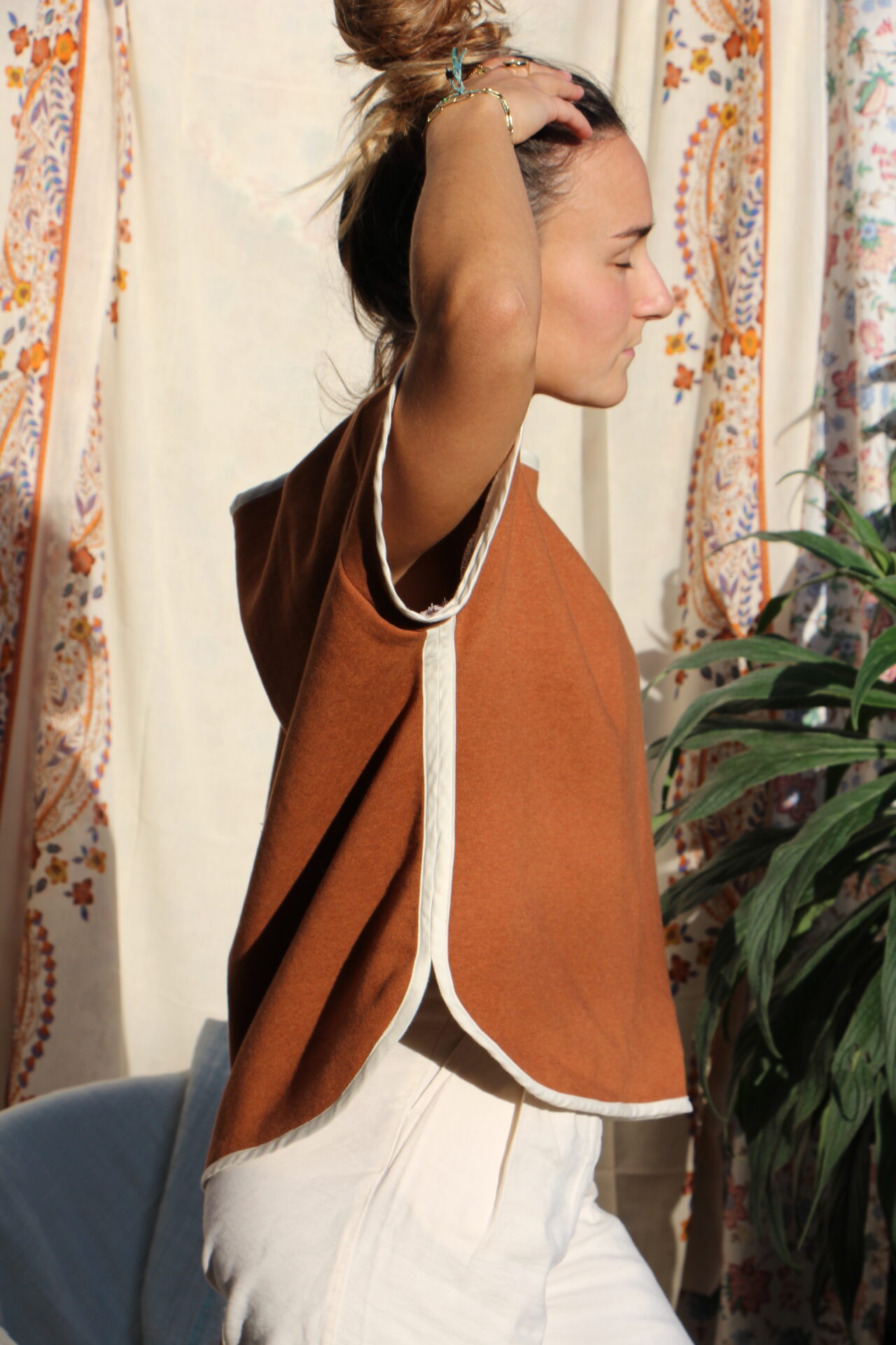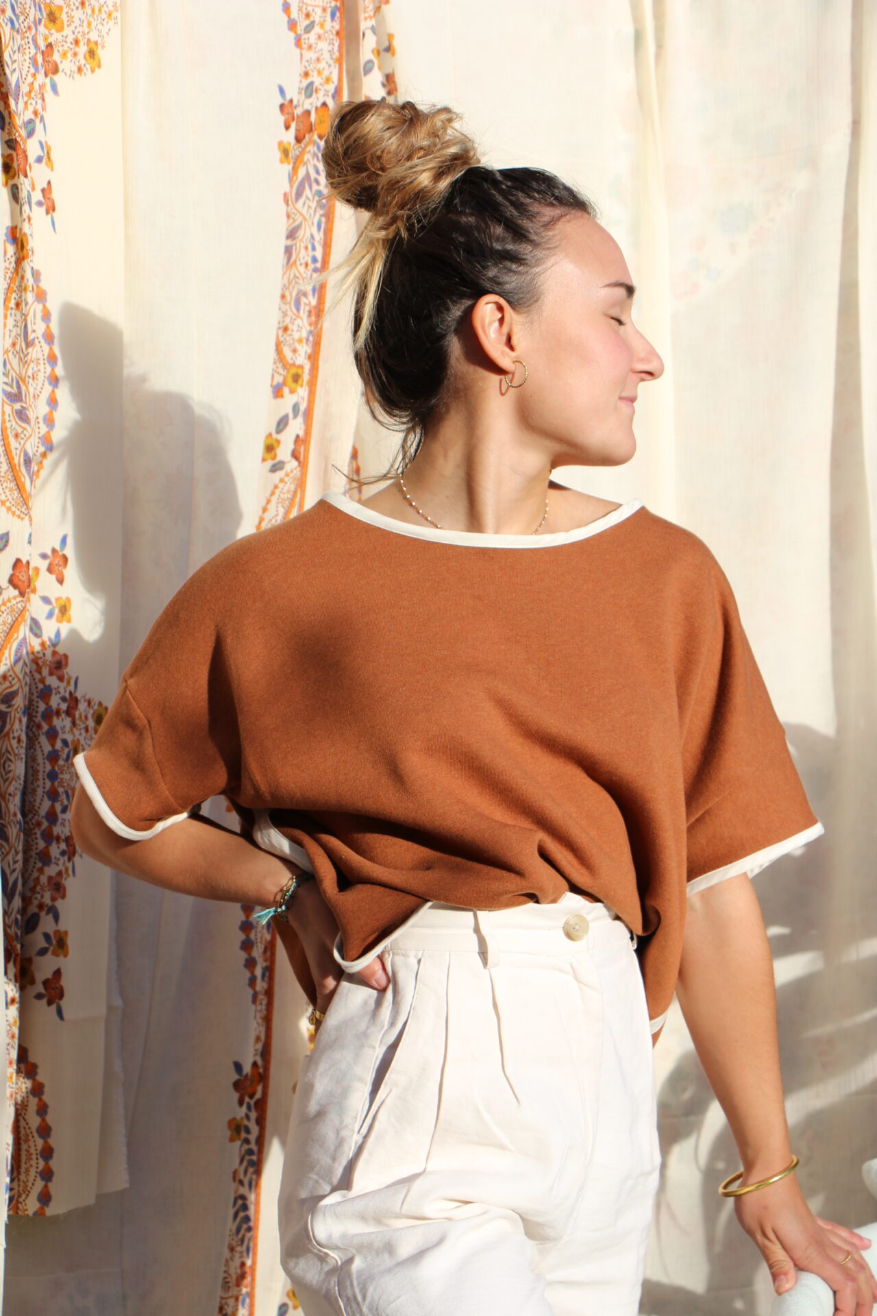 Finitions de manches, d’encolure et de bas par un biais écru contrastant.