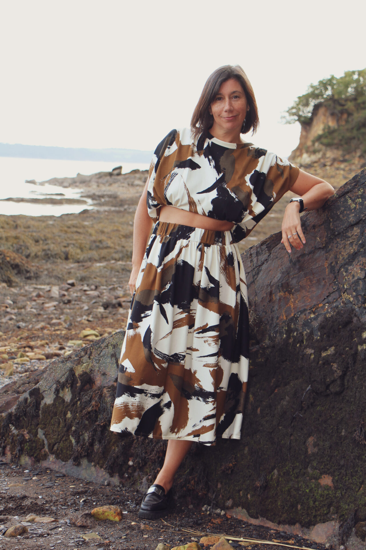 Jeu de plissés aux épaules et de fronces à la taille.