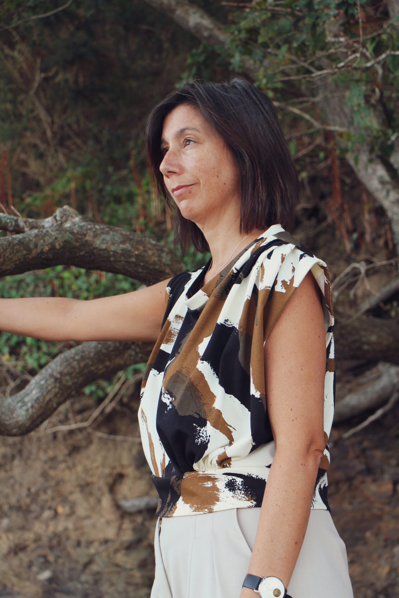 Une coupe légèrement crop top (dévoile la peau seulement en levant les bras).